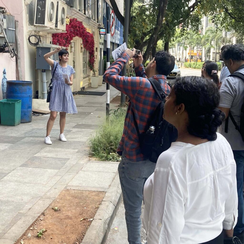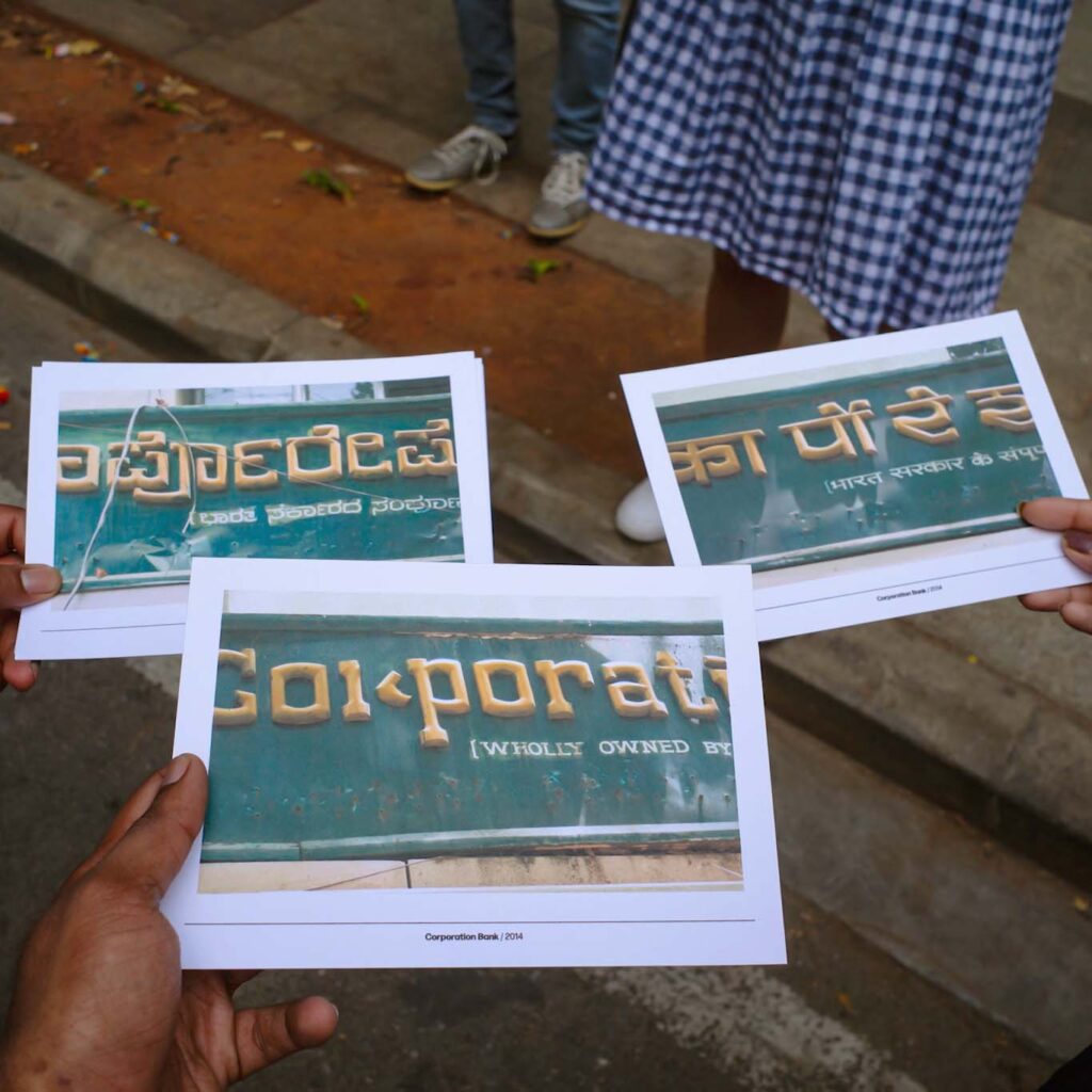 Pooja offered a type walk around M.G. Road as a special workshop experience for participants of DesignUp, a community led and volunteer driven conference for product creators, designers, makers and thought-leaders in India and SE Asia. The focus was on the changing typographic landscape of the city, and lessons for designers about making for multilingual and multiscriptual audiences.